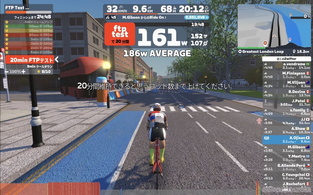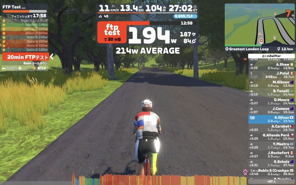 かくいうこのFTPテストの本番20分完走直前のアップでもERGモードが働いてくれます。