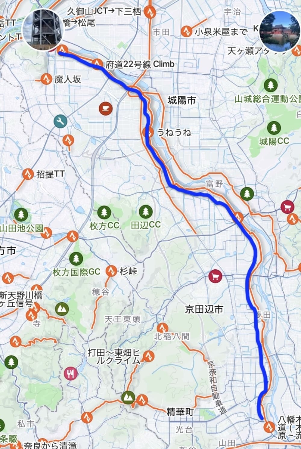 例えばアルパカおじさんは、「京都八幡木津自転車道線」の一部分、この「浜橋」〜「さくら出会い